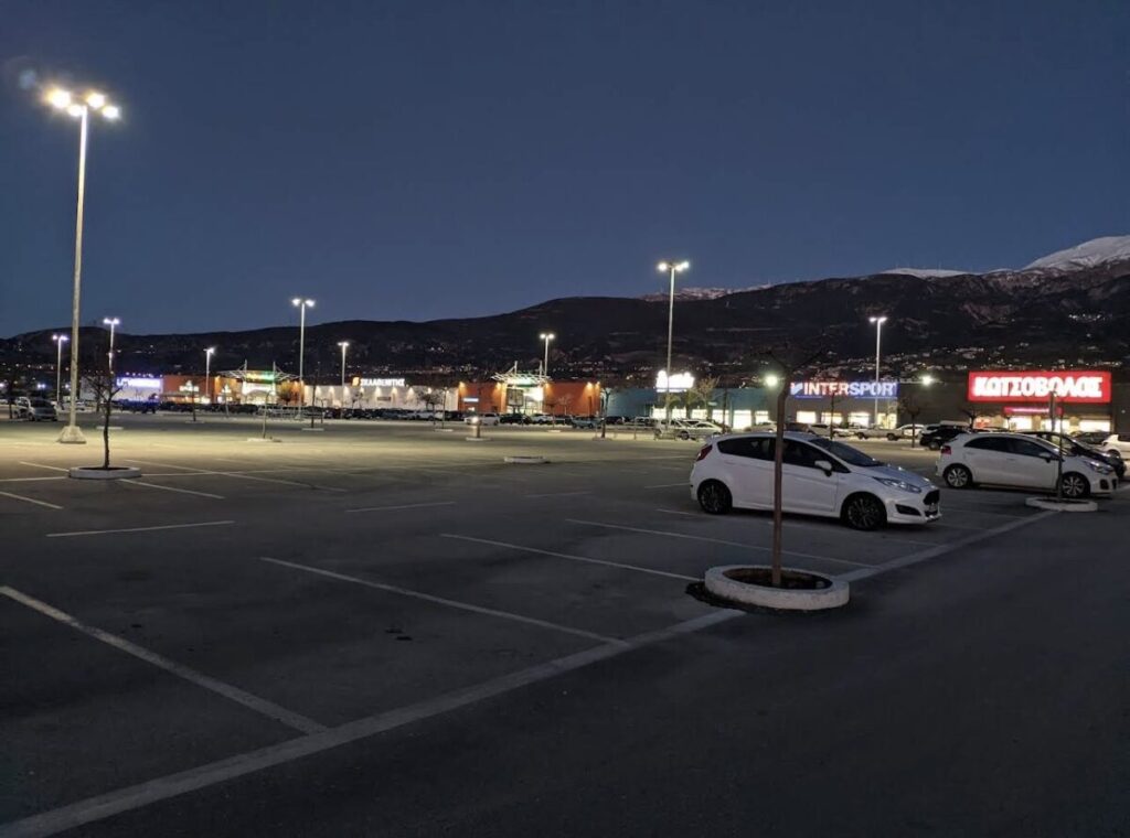 Stor og rolig parkeringsplads ved Patra Mall i Patras. Velegnet som første overnatning efter færgen fra Italien og perfekt sted at proviantere, inden turen går videre. Ofte delt med lastbiler.