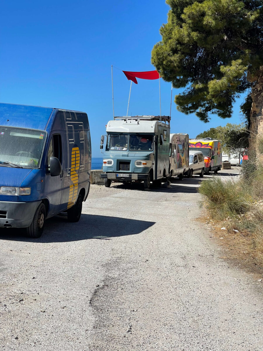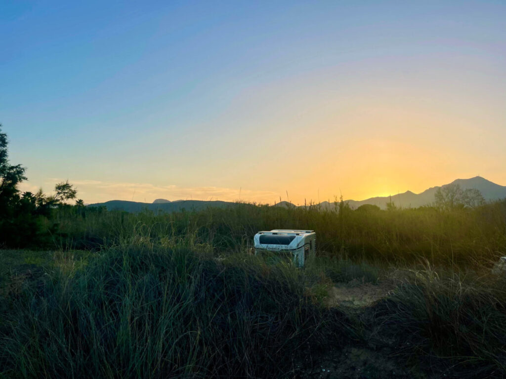 Grus parkeringsplads ved Platja de l’Auir. Pladsen er lidt beskidt, men området er roligt, og stranden er virkelig fantastisk. Der er offentlige skraldespande i området, og det fungerer fint som en enkel overnatning tæt på naturen.