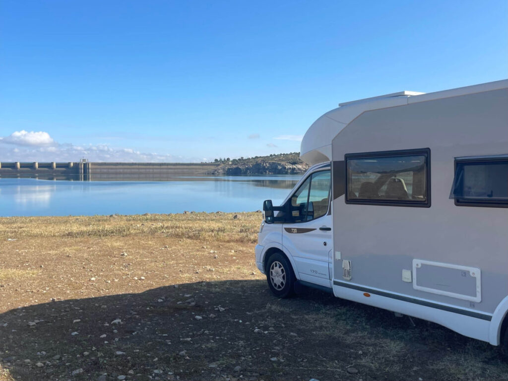 Overnatningsspot på asfalt parkeringsplads ved Presa del Embalse de Villalba de los Barros med udsigt direkte ud over søen. Der er nem adgang til vandet, og vi både badede og fiskede her. Et roligt sted omgivet af åbent landskab, hvor man virkelig mærker stilheden og det langsomme tempo. Især smukt i de tidlige morgentimer og ved solnedgang, når lyset spejler sig i vandet. Ingen service.