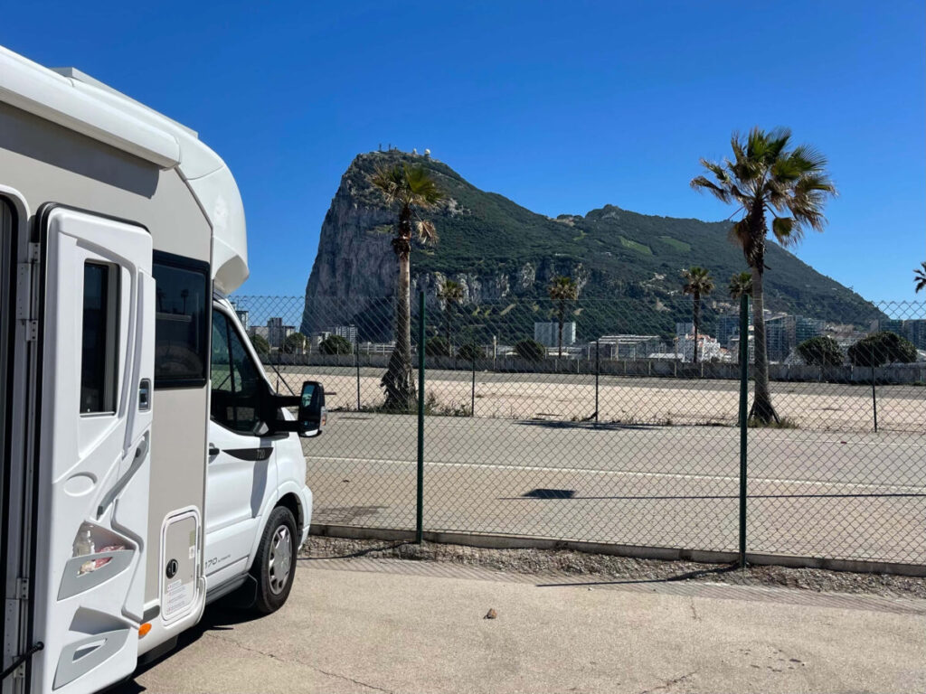 Parkeringspladsen vi anbefaler, hvis du vil besøge Gibraltar. Herfra er der gåafstand til grænsen – du skal blot gennem paskontrollen og krydse landingsbanen, så er du inde i Gibraltar. På havnen er der mulighed for tømning og vandpåfyldning, og der er også gåafstand til byen La Línea med indkøb og byliv.