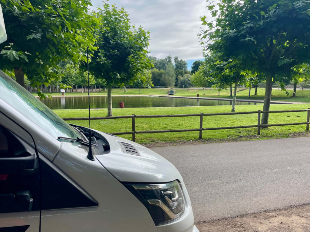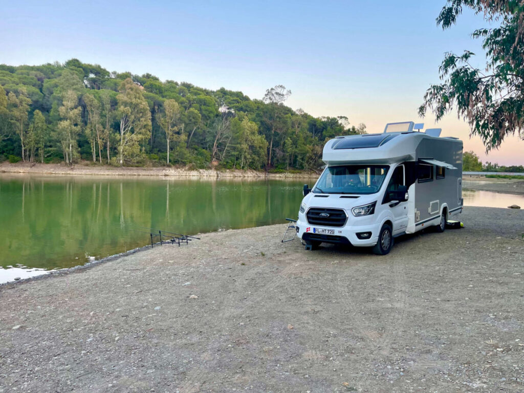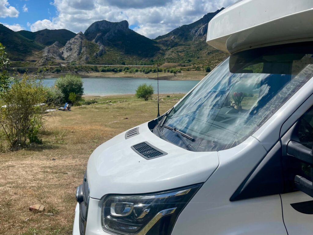 Overnatning ved Parking Embalse de Casares, som ligger helt op ad dæmningen ved Embalse Casares de Arbas. Vi tilbragte et par dage her og oplevede området som meget stille – der kom kun en håndfuld mennesker forbi i løbet af tiden.