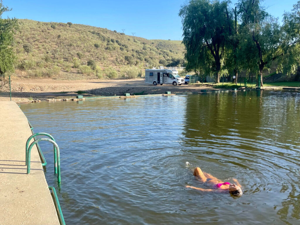 Ophold ved Piscina Natural La Cantera, når man kommer fra Alcántara og kører over den imponerende Alcántara Roman Bridge. Et helt fantastisk sted, hvor en charmerende sø og de bløde omgivelser straks får tempoet til at falde.