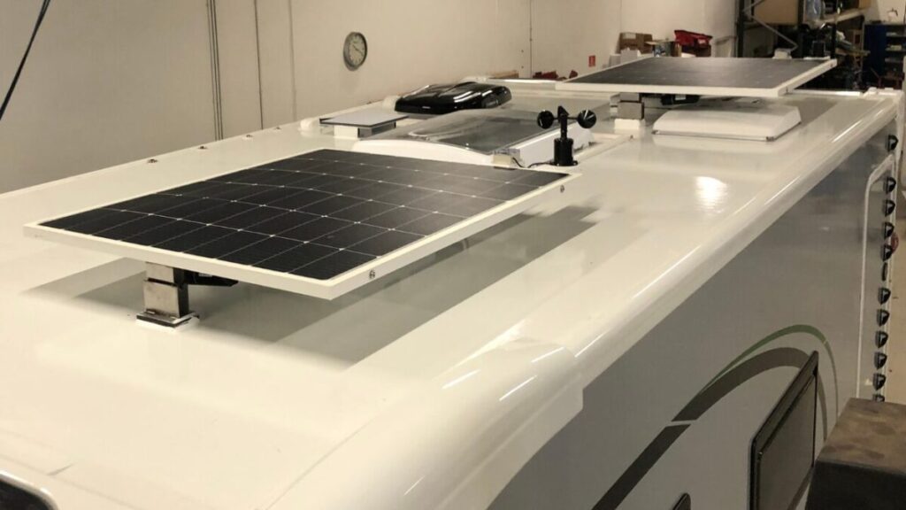In our first motorhome, a Chausson 720 Titanium Preimium, we had 2 × 455-watt mono solar panels mounted flat on the roof – a total of 910 watts.