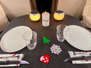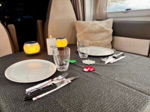 Tallerkenerne er lette, stabile og geniale både til mad og som små serveringsfade – helt ideelle til livet på farten. Og til sidst glassene kraftige, stabile og behagelige at holde om. De er lavet i gennemsigtigt polycarbonat, så de ligner rigtige glas. Vi har fire med ombord, klar til vand, vin og hyggelige aftener.