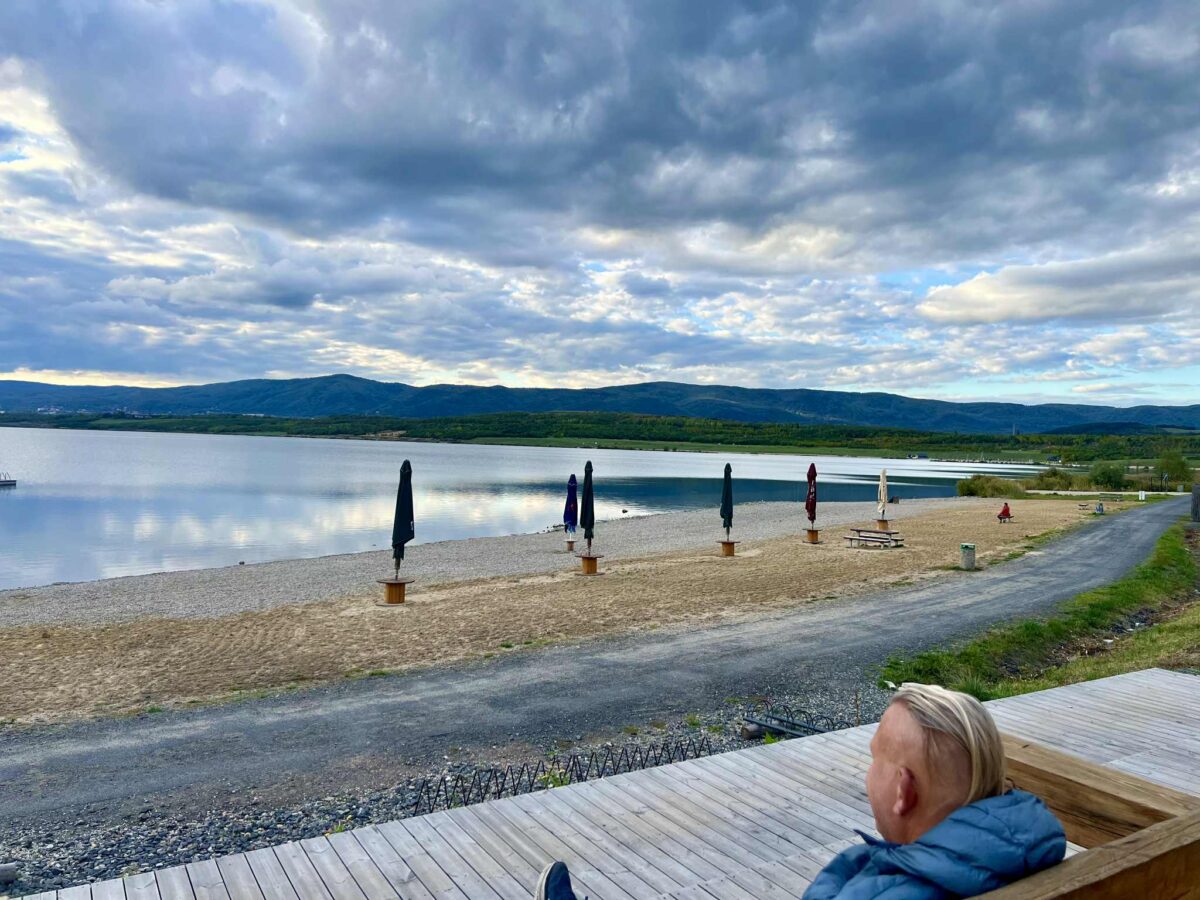 Rundt om Jezero Milada var der anlagt flere strandområder, hvor man kan bade direkte fra bredden. Vandet var klart, og stemningen summede af liv.