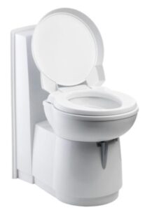 En toiletskål inde i autocamperen og en aftagelig affaldstank, også kaldet en kassette.