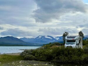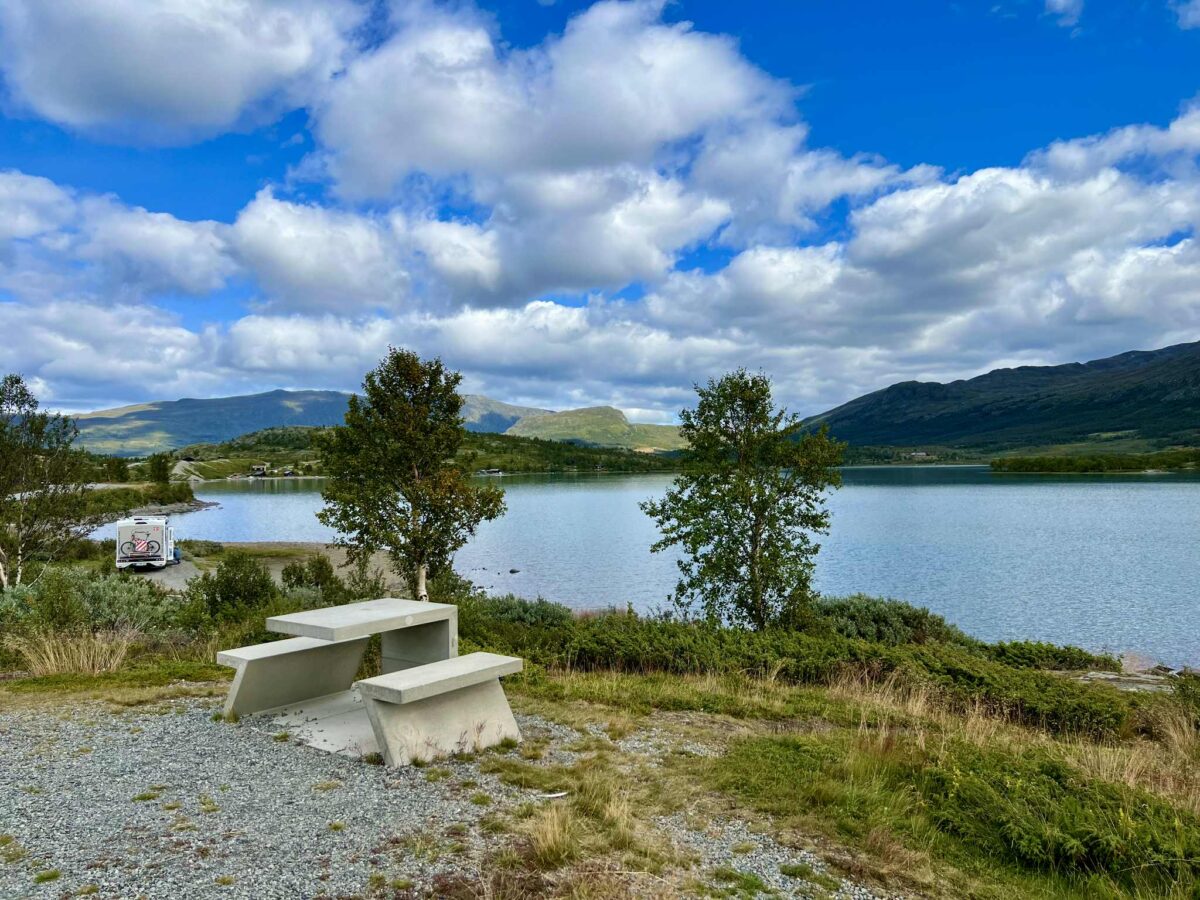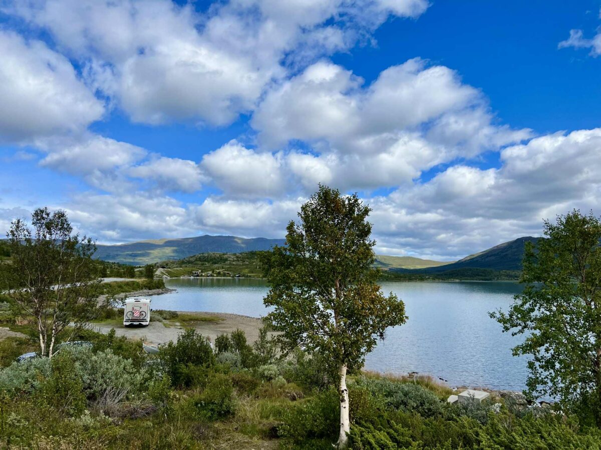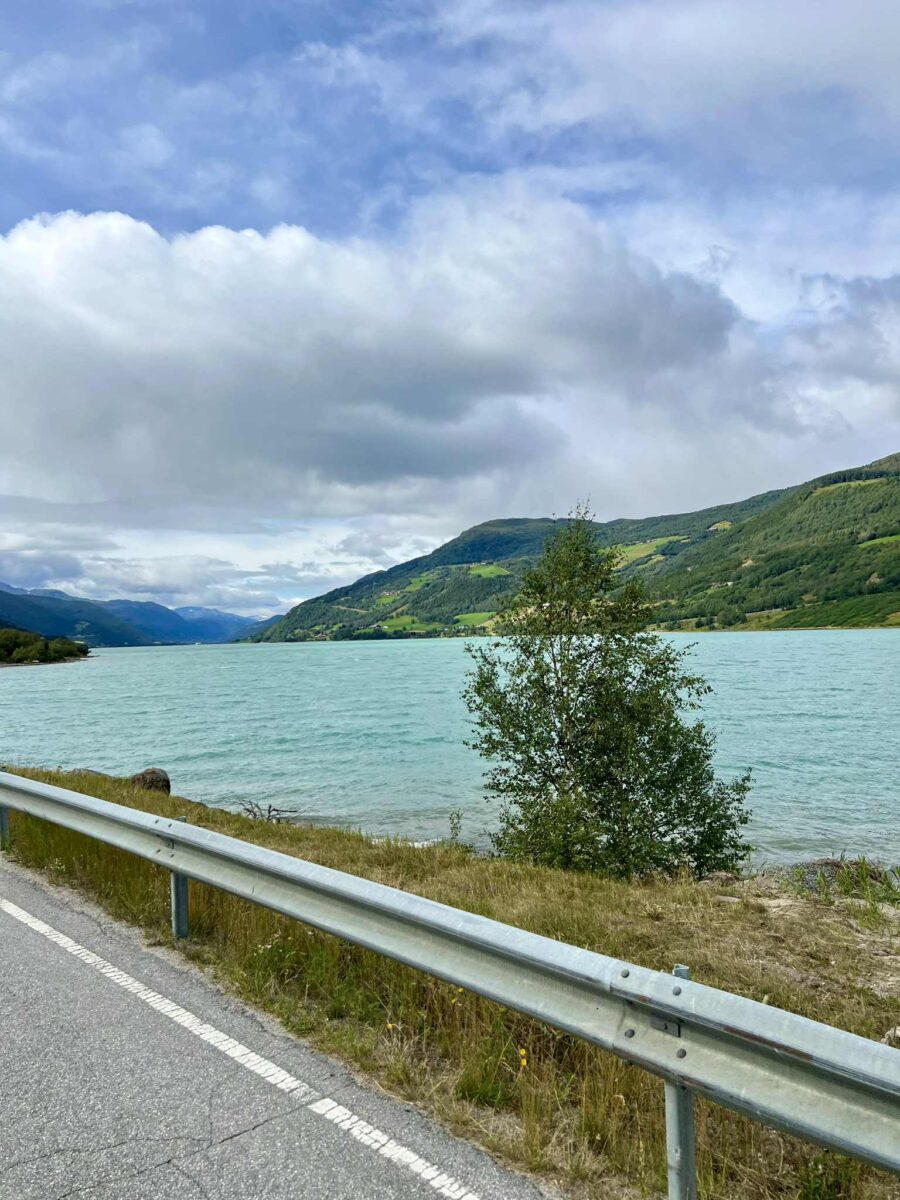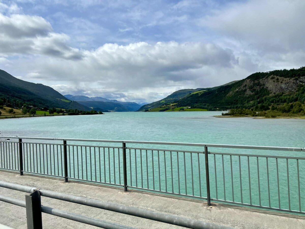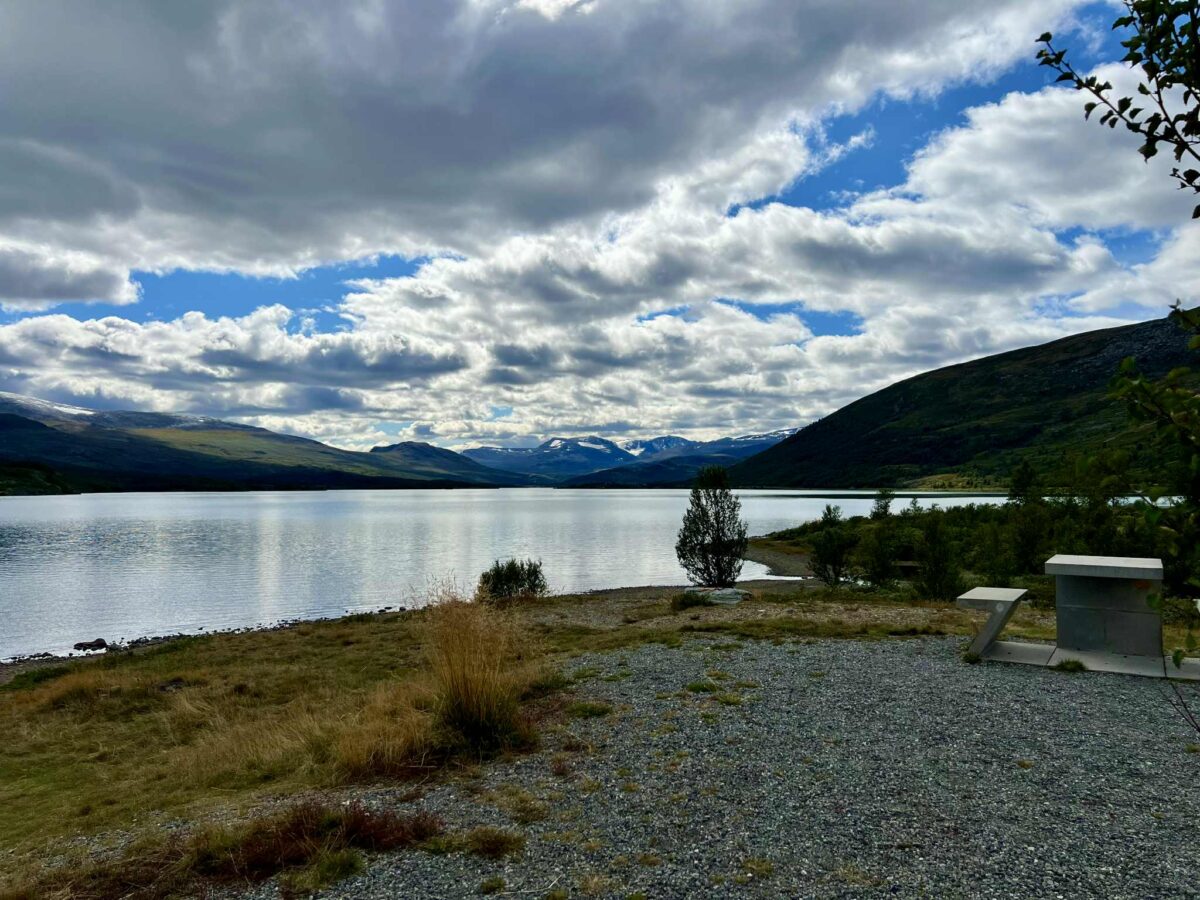 Vi kom kørende nordfra i vores autocamper, og allerede inden søen viste sig, kunne vi mærke, at vi var på vej ind i noget helt særligt. Skiltene fortalte os, at dette ikke var en almindelig vej, men en national turistvej.Rute 51, også kaldet Valdresflyvegen, følger Sjodalselva, en brusende elv, der henter sit vand fra Jotunheimens gletsjere og sneklædte tinder. Fjeldsiderne rejste sig stejlt på begge sider, og vi måtte næsten tvinge os selv til at holde øjnene på vejen, fordi udsigten hele tiden ændrede sig.