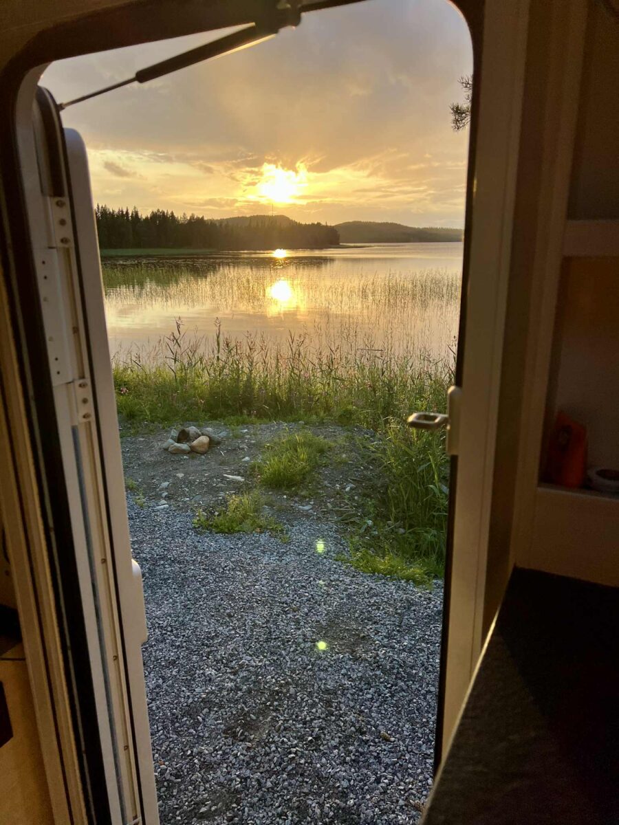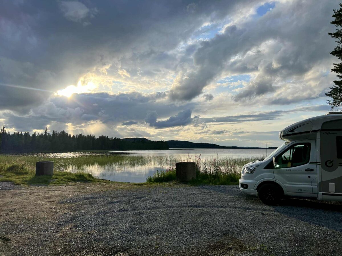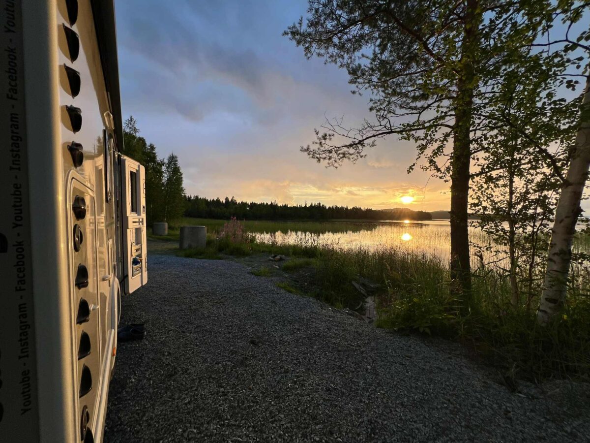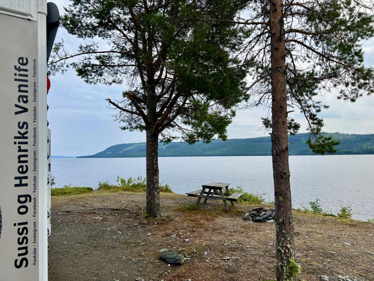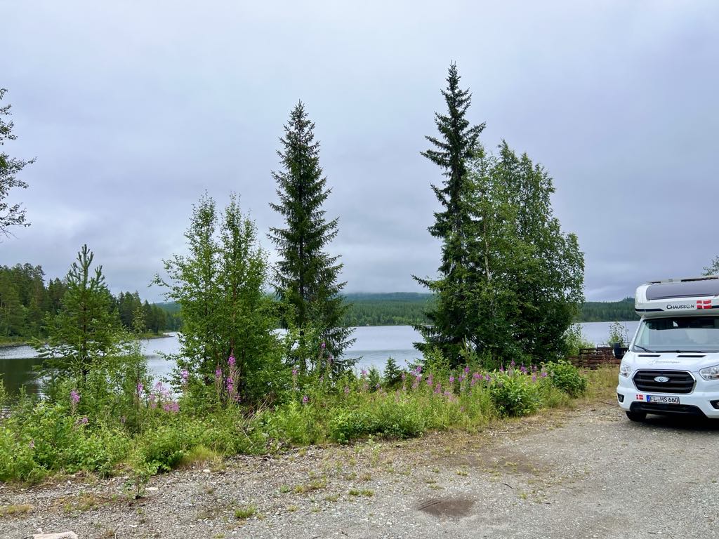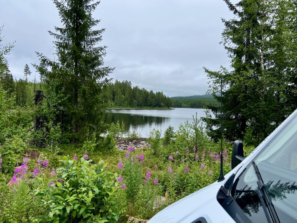 Vi er kørt videre på vores eventyr gennem Sveriges dybe skove og har nu fundet endnu et fantastisk sted at overnatte. Igen har vi forladt den “officielle rute” og taget en afstikker – og det føles helt rigtigt. Denne gang er vi landet et sted, hvor vi har udsigt til en fredelig sø, omgivet af høje træer og spejlblankt vand.