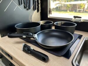 Ting vi har i camperen Vores gryde og pandesæt i autocamperen december 15, 2025 / Vi er virkelig glade for vores gryde- og pandesæt fra isabella, og især de aftagelige håndtag gør en kæmpe forskel i en autocamper. Når vi ikke laver mad, kan håndtaget nemt klikkes af, så gryder og pander kan stables oven på hinanden og fylder minimalt i skabet. Håndtaget er let at tage af og på og takket være dobbeltsikringen sidder det solidt fast, når det er i brug.Det er netop den slags gennemtænkte løsninger, der gør hverdagen på hjulnemmere -We found our way! Tak fordi du læser med her på bloggen